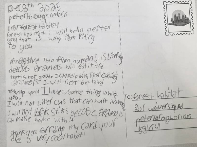 For student's final science culminating task, they were asked to write a postcard to a local habitat and provide two environmental ways they would like to support their habitat of choice. They were asked to use their self-assessment checklist to ensure they were meeting the criteria for this final assignment.